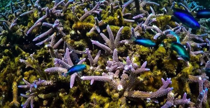 最有特色的是藍紫色的鹿角珊瑚,它們是絢麗的藍紫色,規模很大.死亡的鹿角珊瑚會變成白色,而活著的顏色就很鮮豔,完全可近距離觀察軸孔珊瑚裡面的活體水螅體狀態。珊瑚之所以有美麗的顏色,主要靠珊瑚蟲細胞內的共生藻。共生藻含有多種色素,在不同環境下會顯出不同顏色,一旦自然條件被破壞,共生藻便會死亡或遭珊瑚排出,珊瑚就會白化。