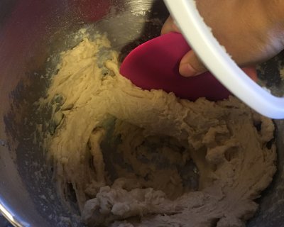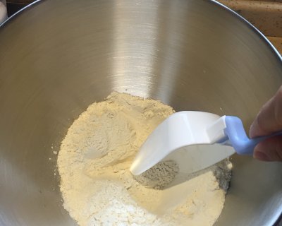 6. 用刮刀清理一下四壁,加一點點麵粉進去,一點點噢,千萬不要一抓一大把,酥皮的麵糰一定要軟硬度剛剛好,千萬不能粘手也不能太乾,這個一定要自己把握好!