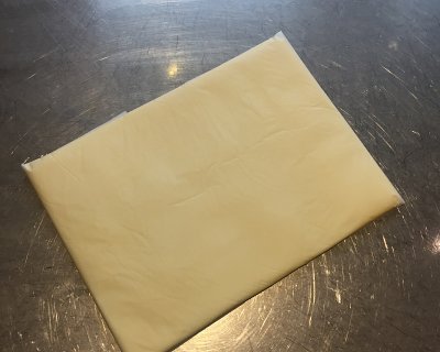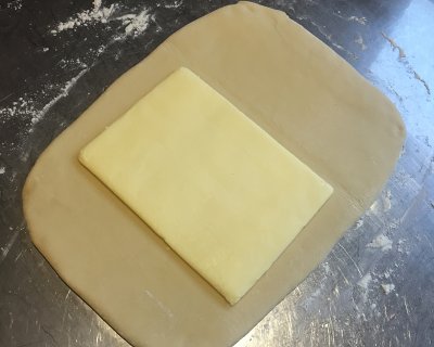 9. 將裹入用的黃油包上烘焙紙,用擀麵杖檊成16x12厘米厚薄均勻的黃油片,放冰箱冷藏定型15分鐘,千萬不能凍得太硬!