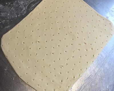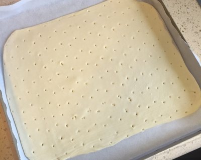 21. 切出一半的酥皮,擀成25x30厘米的長方形麵皮,用打孔器均勻扎出小孔,沒有打孔器的可以用叉子,另外一半酥皮可以用來做蝴蝶酥或各種派,如果暫時不用可以用保鮮膜包好放冰箱冷凍可以儲存很久的噢