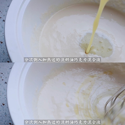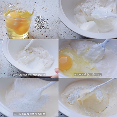 2號碗酸奶油和酸奶混合均勻,分次加入常溫雞蛋混合,擠少許檸檬汁,篩入澱粉攪拌均勻至無顆粒狀態