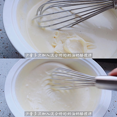 1號碗中奶油乳酪室溫軟化,和糖粉混合攪拌至細膩狀態