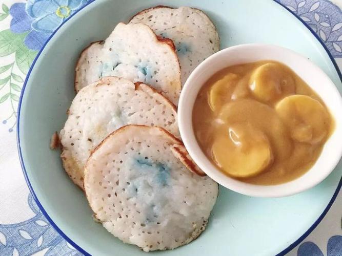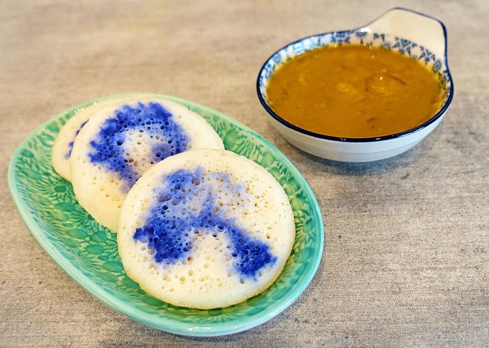 娘惹米糕是由大米和椰子水做成的一種蓬鬆煎餅,上面通常配以香蕉醬。大多數人還會新增蝶豆花的汁液,賦予煎餅特別的藍色。