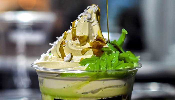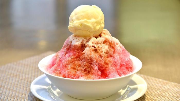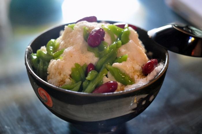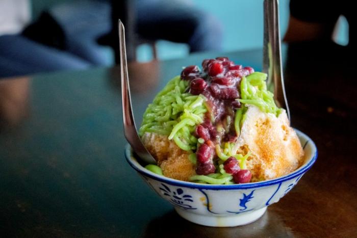冰沙裡含有甜玉米、紅豆、尼巴棕櫚籽和果凍等。這些冰沙堆成小山狀,上面淋上了彩虹糖漿、煉乳和椰糖。紅豆冰也有各種各樣的澆頭選擇,你可以根據自己的喜好定製。