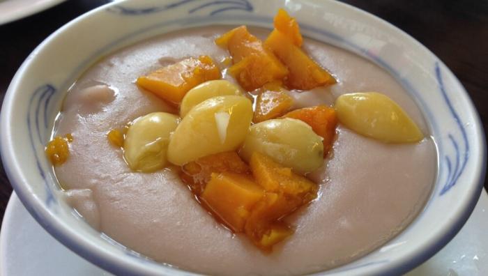 芋泥的主要成分就是芋頭,糖漿賦予了它甜味。裡面還可以加入南瓜、銀杏等,讓芋泥變得更加柔滑稠密。