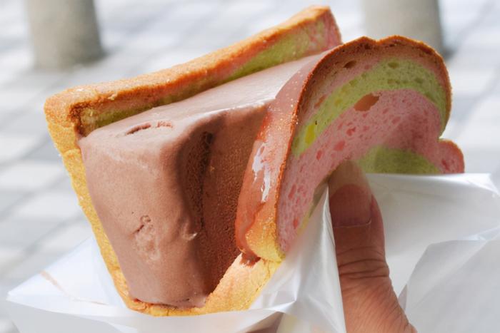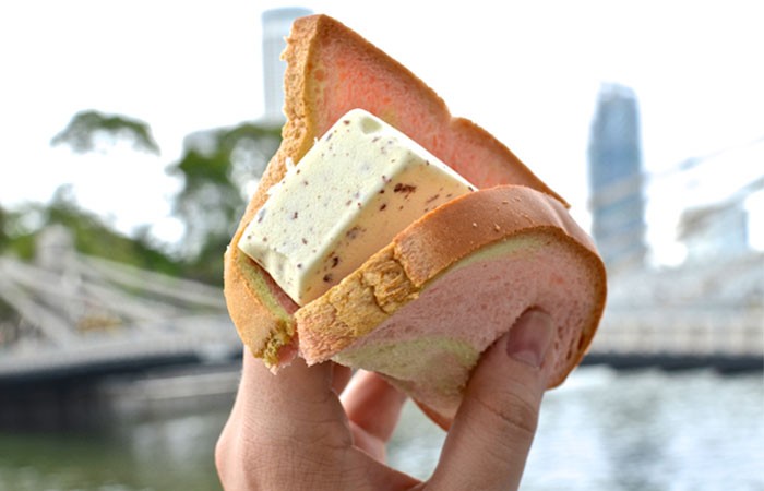 冰淇淋三明治裡有班蘭風味的麵包或酥脆的華夫餅。它的口味有紅豆、香草、巧克力、草莓、榴蓮甜玉米等。