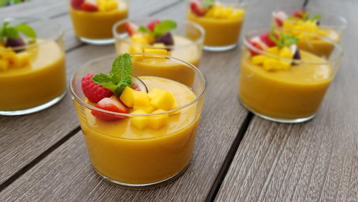 除了成熟的芒果,裡面還加入了煉乳和糖,因此布丁更加濃稠。有些還會先把芒果做成泥狀,然後再加入奶油和糖。如果想要獲得類似果凍的濃稠度,還可以新增明膠和糖。吃之前,先加一點牛奶或椰奶增強風味,當然,既然是夏季,冷藏的效果是最好的。