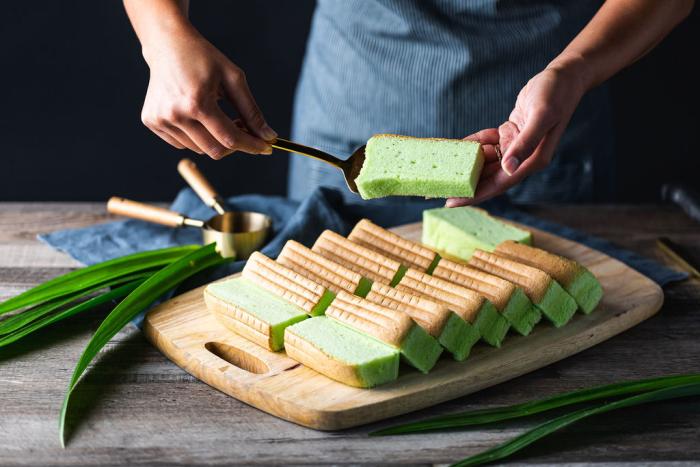 班蘭又稱香蘭,是一種熱帶綠色植物,帶著獨特的天然芳香。班蘭汁賦予了戚風蛋糕清新香甜的味道,同時也讓蛋糕呈現鮮豔的綠色。班蘭戚風蛋糕裡還加入了椰奶,為蛋糕帶來了乳脂狀的濃稠度。