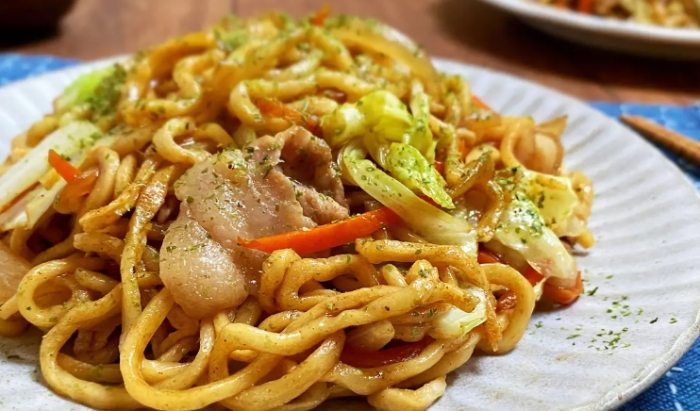 • 日式炒麵(豚玉)($180): 宵夜場靈魂!就是那種道地的日式炒麵味道,麵條油潤夠味,醬汁帶點微酸,配料有豬肉片、高麗菜、紅薑絲,上面再放顆半熟蛋。戳破蛋黃拌著吃,罪惡但超級滿足!