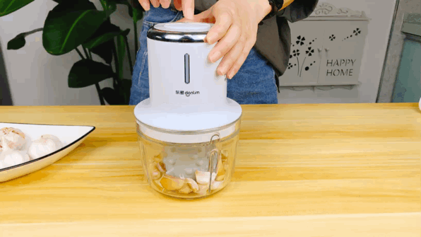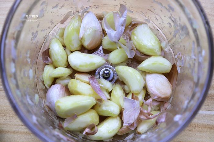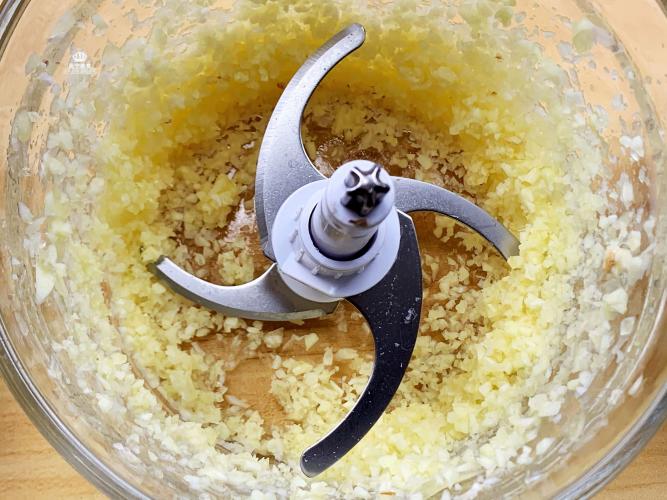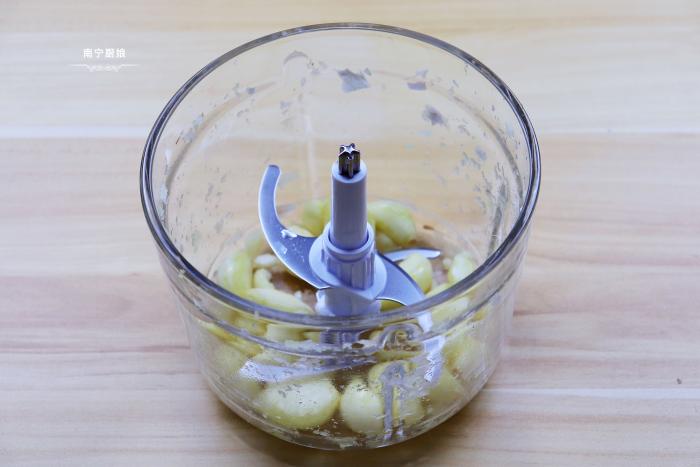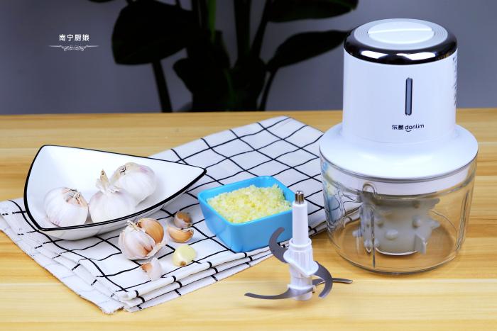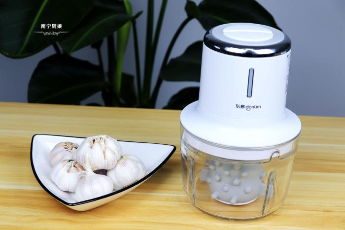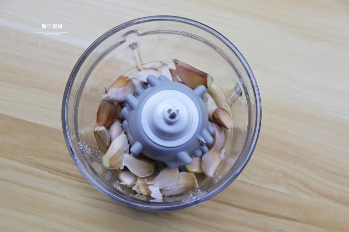 6、蓋上蓋子後,按壓1檔按鍵3秒,2頭大蒜的量就瞬間變成了蒜蓉,大蒜被切得很細膩,用來炒空心菜肯定會很香。