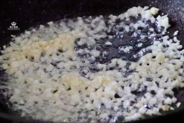 8、起鍋,熱鍋倒入涼油,再把蒜蓉倒入鍋中,開大火爆香。