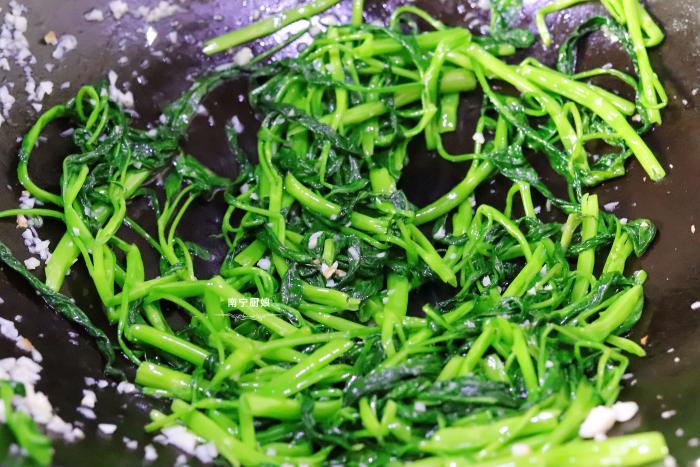 9、蒜蓉的香味被逼出來後,把空心菜放入鍋中,繼續大火快炒,炒至空心變軟,放入一勺食鹽翻炒均勻調味即可出鍋。